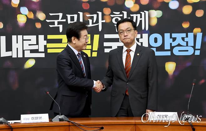 | ▲ 최상목 대통령 권한대행 부총리 겸 기획재정부 장관과 더불어민주당 이재명 대표가 13일 서울 여의도 국회에서 만나 악수를 하고 있다. |