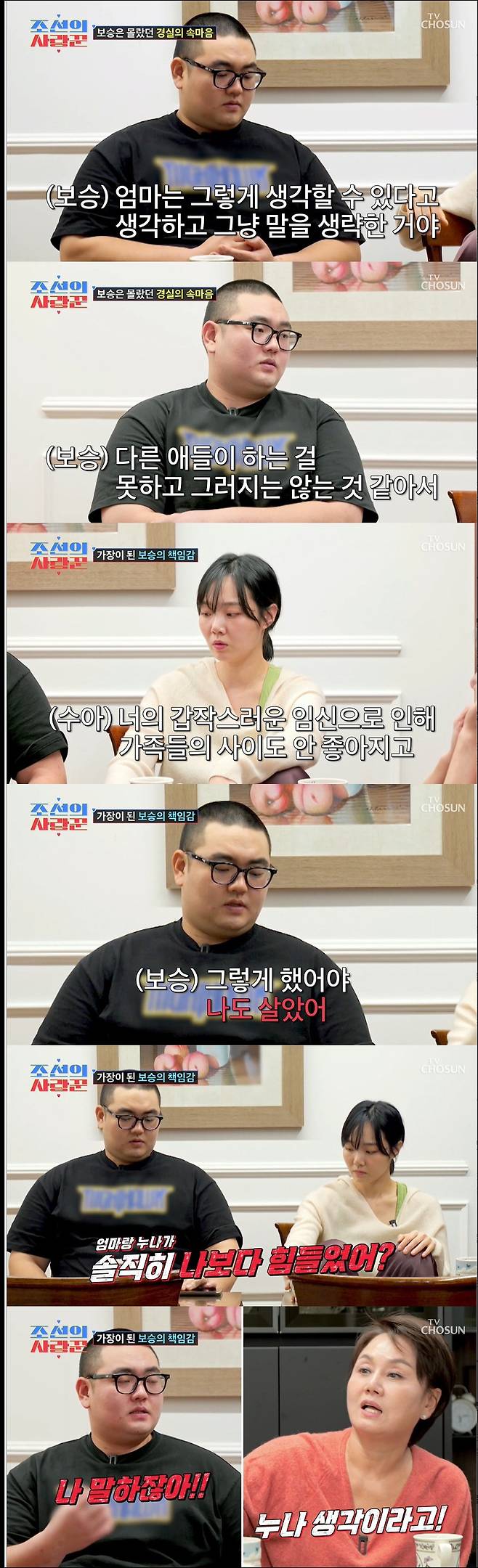 이에 이경실도 속마음을 털어놨다. 이경실은 "엄마가 보승이 너를 안 볼 때 혼자 생각을 했다. 뭐가 이렇게 화가 날까. 이미 애가 태어나고 다 받아들여야 되는데 왜 이렇게 화가 날까 가만히 생각해봤는데 내 아들이 어린 나이에 가장이 돼서 책임을 져야 한다는 게 그렇게 속상하더라"라고 밝혔다. 이경실은 "네 친구들은 더 놀고 젊음을 누리고 여행도 다니고 하는데 너는 처자식을 위해서 책임을 져야 하는 가장이라는 자리에 있어야 하지 않냐. 벌써부터 그래야 한다는 게 그렇게 속상했다. 그게 그렇게 안타깝더라"라고 손보승은 몰랐던 마음을 고백했다.