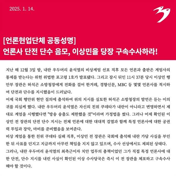 | [언론현업단체 공동성명] 언론사 단전 단수 음모, 이상민을 당장 구속수사하라! |