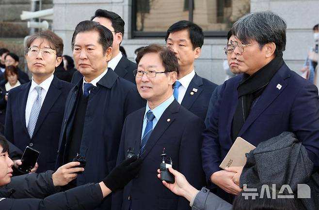 [서울=뉴시스] 황준선 기자 = 윤석열 대통령의 탄핵심판 첫 변론기일인 14일 오후 정청래 단장 등 탄핵소추단이 서울 종로구 헌법재판소에서 변론을 마치고 취재진 질문에 답변하고 있다. (공동취재) 2025.01.14. photo@newsis.com