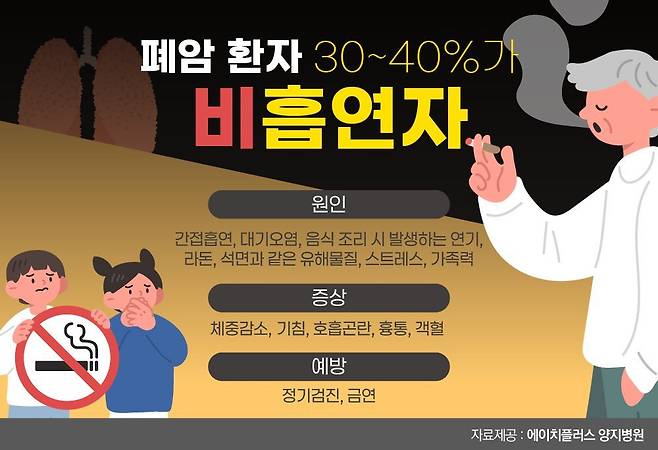폐암은 10대 암 중에서 가장 사망률이 높다. 국가암정보센터 자료에 따르면 2023년 암으로 사망한 전체 환자 중 폐암 사망자는 남성의 경우 26.3%, 여성은 15%에 달했다. 폐암은 흡연이 가장 큰 원인으로 흡연자는 비흡연자에 비해 폐암에 걸릴 확률이 20배 가까이 높은 것으로 알려져 있다. 흡연을 하지 않는 폐암 환자도 늘고 있는데, 우선 간접흡연을 주요 원인으로 꼽는다. 담배를 직접 피우는 경우 필터를 통해 나쁜 성분을 걸러내고 흡입하지만 비흡연자는 그런 여과 과정이 없어 발암물질 등에 노출되기 쉽다.
