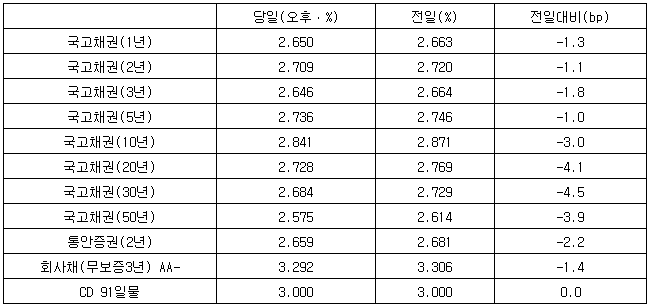 10년물 금리는 연 2.841%로 3.0bp 하락했다. 5년물과 2년물은 각각 1.0bp, 1.1bp 하락해 연 2.736%, 연 2.709%에 마감했다.