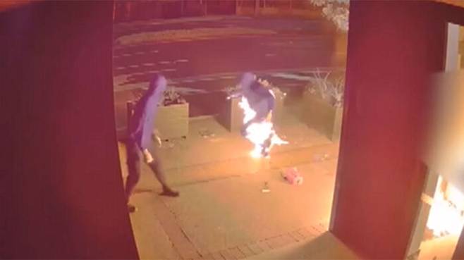 마지막 한 방울까지 모두 쏟아붓고 라이터로 불을 붙인 순간, 불길이 순식간에 타오르며 남성의 몸에도 옮겨붙습니다.