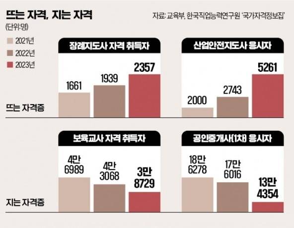 2022년 1월 중대재해처벌법이 시행된 이후 안전 관련 자격도 각광받고 있다. 한국산업인력공단에 따르면 산업안전기사 자격 필기시험 응시자는 2021년 4만1704명에 그쳤는데 이듬해 중대재해법 시행 이후 5만4500명으로 늘더니 2023년 8만253명으로 불과 2년 사이에 두 배 가까이 폭증했다. 소방안전관리사 1차 응시자도 2020년 5만9534명에서 2022년 7만7337명으로 늘어났다. 고용노동부 관계자는 “산업 환경과 사회 변화에 따른 인력 수요를 면밀하게 파악해 자격 종목을 신설 및 보완하는 작업이 중요하다”며 “산업 현장 의견이 국가기술자격에 신속히 반영되도록 법령 개정을 함께 추진하고 있다”고 말했다.