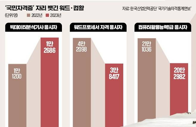 ‘워드프로세서’ 응시자도 2021년 5만5707명에서 2023년 3만8417명으로 2년 만에 32.1% 줄었다. 한 기업 인사담당자는 “자동화 툴과 AI 등장으로 엑셀 등 기본 문서 작업이 훨씬 수월해졌다”며 “컴활 자격은 큰 의미가 없어진 지 오래”라고 말했다. 다만 여전히 공무원 시험 등에서 가산점을 주는 자격이라 명맥은 유지하고 있다.