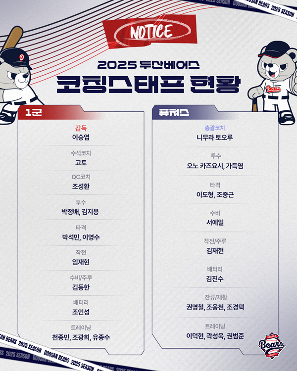 두산은 14일 "2025시즌 코칭스태프 보직을 확정했다"고 공식 발표했다.