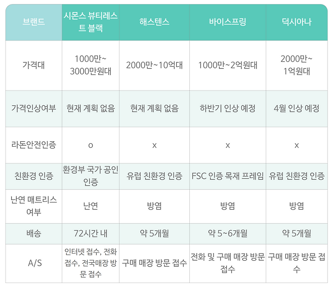가격대의 편차도 크다. 시몬스 뷰티레스트 블랙은 1000만원에서 3000만원대이며, 해스텐스는 2000만원에서 최고 10억원대에 이른다. 바이스프링은 1000만원~2억원대, 덕시아나는 2000만원~1억원대 수준이다.