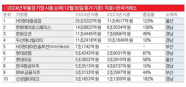 14일 국제신문이 한국거래소로부터 자료를 받아 부울경 코스피·코스닥 상장기업 200여 곳을 분석한 결과, 2024년 12월 30일 종가 기준 동남권 시총 1위 기업은 HD현대중공업(25조5222억 원·울산 소재)이었다. 2023년 12월 28일 종가 기준 현대중공업 시총은 11조4517억 원으로 1년새 무려 123%가 증가했다. 부울경 시총 2위와 3위는 한화에어로스페이스(14조8822억 원, 경남), 한화오션(11조4445억 원, 경남)이었다.