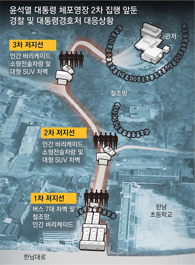 경찰도 준비를 마친 분위기다. 14일 오전 10시경 서울·인천·경기남부·경기북부 등 수도권 경찰청 광역수사단 산하 지휘관들은 서울 서대문구 홍제동 경찰청 안보수사과 청사에서 3차 회의를 열었다. 경찰은 앞서 10일에 1차 지휘관 회의, 13일에 2차 지휘관 회의를 열고 대통령 체포를 준비했다. 3차 회의에선 ‘요새화’된 관저 진입 전략, 철조망과 버스·스포츠유틸리티차량(SUV) 차벽 와해 방안, 저항하는 경호처 직원들을 체포할 방법 등이 논의된 것으로 알려졌다.