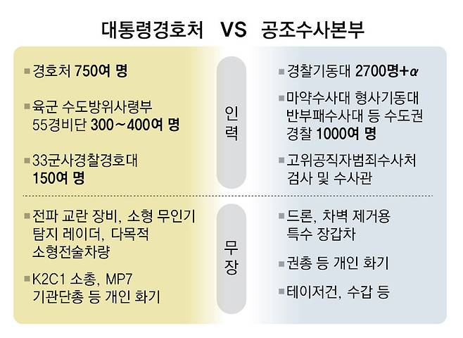 경호처 내부에선 무기 사용이나 무력 충돌은 피해야 한다는 기류가 확산되고 있다. 이날 수사기관 관계자는 “경호처도 대통령 경호보단 적법한 절차에 방점을 찍는 분위기”라며 “1차 체포 저지 때와는 달리 경호처가 ‘빈 총’이라도 갖고 나오는 상황은 없을 것”이라고 전했다. 현장에 있는 직원들이 영장 집행을 저지하지 않을 것이란 경호처 내부 목소리도 나온다. 한 여권 인사는 “현장 요원들도 적법 절차에 의한 임무만 수행할 뿐 무력 충돌은 피하려 할 것”이라고 말했다.