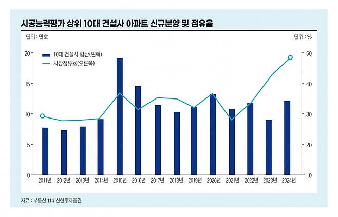 2024년까지 일명 ‘10대 건설사’의 주택공급 물량은 예년과 비슷한 수준을 유지했다. 보통 7만~10만 가구 내외다. 그러나 전체 물량에서 차지하는 비중은 부동산 경기가 정점이던 2021년 30%를 밑돌던 것이 지난해 절반까지 급격히 상승했다. 중견 건설사의 공급이 크게 줄었기 때문으로 분석된다.