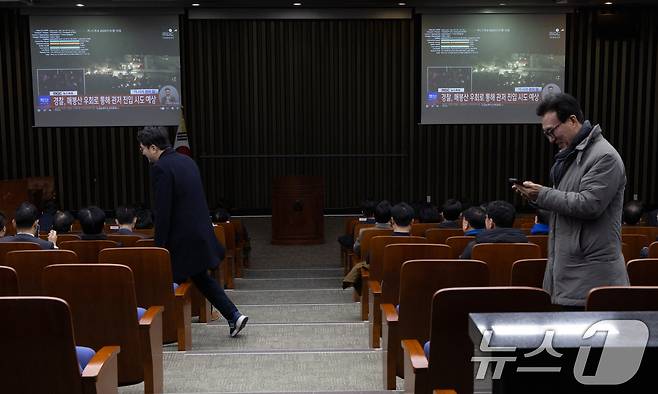 (서울=뉴스1) 이재명 기자 = 더불어민주당 의원들이 15일 서울 여의도 국회에서 열린 비상의총에서 공수처의 윤석열 대통령 체포영장 집행 뉴스 생중계를 살펴보고 있다. 2025.1.15/뉴스1