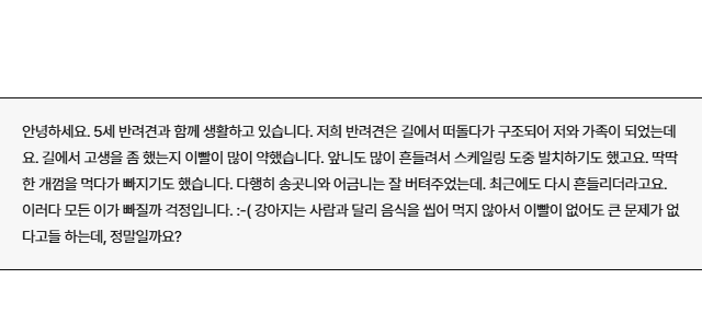 결론적으로 이빨 건강은 반려견의 건강 및 영양섭취와 직결되는 문제이고, 건강 관리를 위해 정기적인 칫솔질과 주기적인 치석제거가 필요합니다.