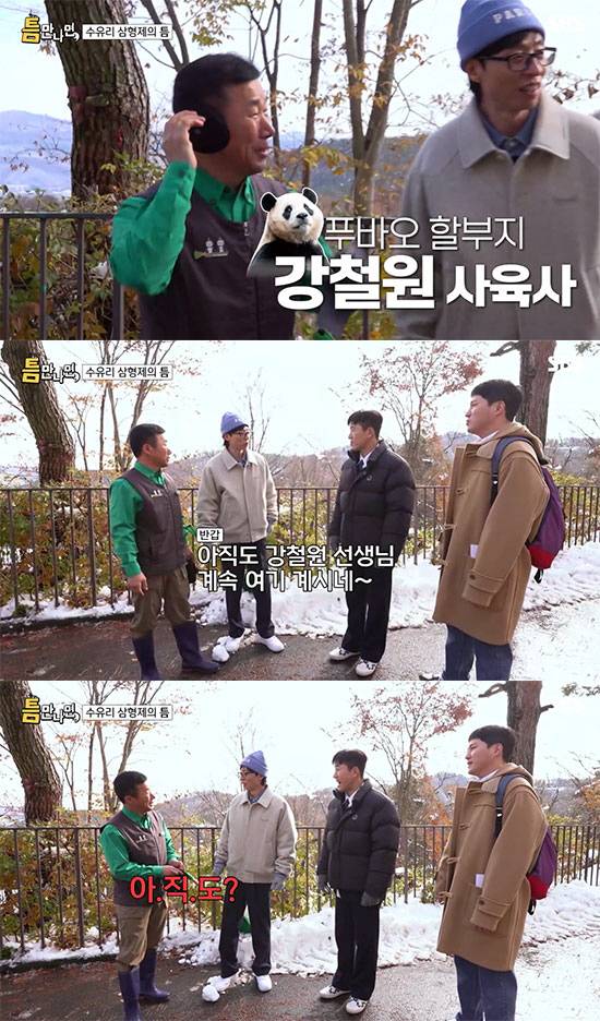 이날 유재석과 김대명, 김종민은 '틈 시간'에 판다를 보러 갔다 '푸바오 할아버지' 강철원 사육사와 만났다. tvN '유퀴즈 온더 블럭'에서 인연이 있는 유재석은 "'유퀴즈'할 때 여기서 뵀다"며 반가운 인사를 했고, 강 사육사는 "눈이 엄청나게 왔다. 얼면 손님들이 넘어질 수 있어서 치워야 한다"며 눈을 치우는 중이었다고 말했다.