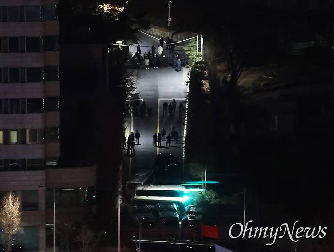 | ▲ ‘내란 우두머리’ 윤석열 대통령 체포영장 집행이 시도되는 15일 새벽 서울 용산구 한남동 대통령 관저에서 대통령실과 경호처 직원으로 보이는 사람들이 저지선을 만들어 대비하고 있다. |