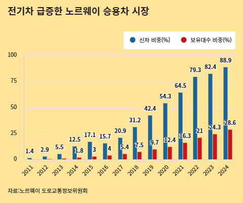 88.9%.지난해 노르웨이에서 팔린 승용차 10대 중 9대는 전기차였습니다. 2023년(82.4%)보다도 크게 늘었죠. 압도적인 세계 1위인데요.