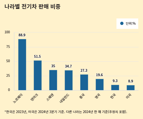 -전 세계의 주목을 받는 전기차 천국, 노르웨이가 2024년엔 전기차 판매 비중 88.9%라는 기록을 세웠습니다. 춥고 넓어서 전기차 보급에 불리하다는 인식을 깼습니다.