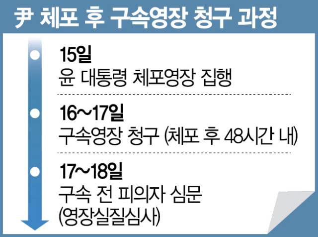 공수처는 영장 청구 전 심야 조사도 강행한다는 계획이다. 공수처 관계자는 “오후 9시 이후인 심야 조사까지 이어질 가능성도 있다”며 “구속영장 청구 등 긴급한 사유가 있을 때는 피의자 동의 없이도 심야 조사가 허용된다”고 설명했다. ‘200쪽 분량의 질문을 오늘 다 소화할 계획이냐’는 질의에는 “체포 기간이 48시간이기 때문에 그 안에 조사가 이뤄질 것이라고 생각하고 있다”고 했다. 구속영장은 통상 체포영장을 받은 법원에 청구하는 만큼 공수처는 체포영장을 발부받은 서울서부지법에 윤 대통령의 구속영장을 청구할 것으로 보인다.