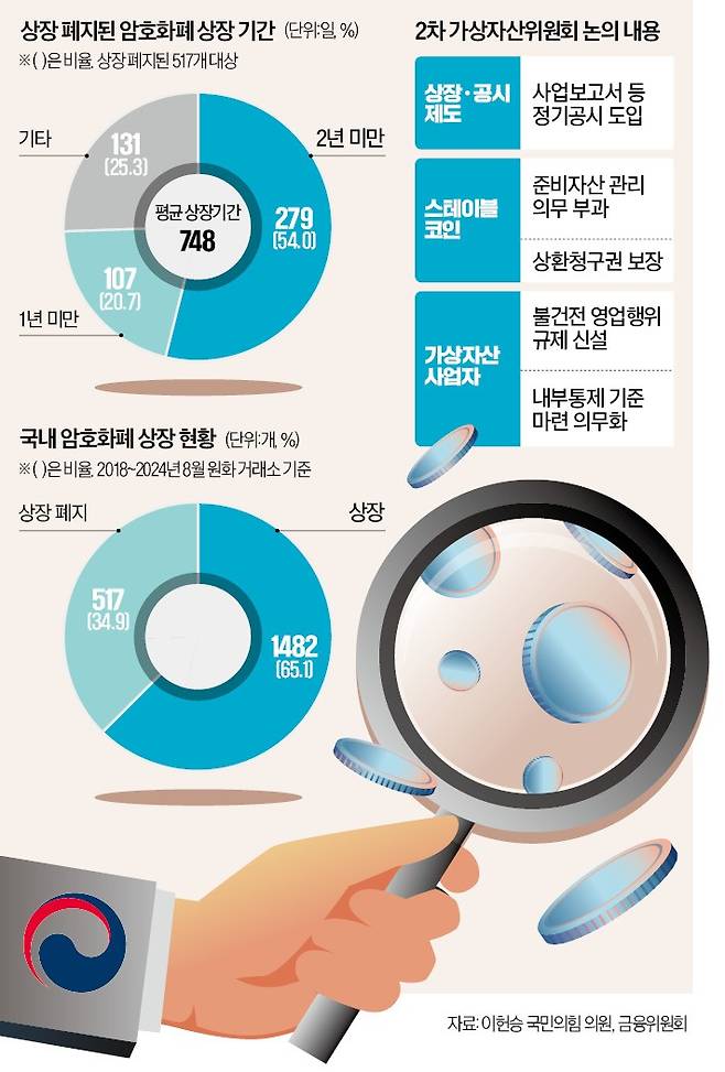 앞으로 국내에 상장하는 암호화폐는 주식처럼 사업보고서 등을 공시하는 방안이 추진된다. 부실 암호화폐의 무분별한 상장을 막기 위해서다. 달러 가치와 1대1로 연동된 스테이블코인을 발행하는 사업자를 규제하는 방안도 마련될 것으로 전망된다.