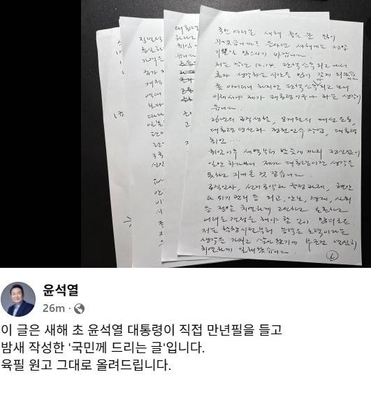 | ▲ 12.3 내란 우두머리 피의자 윤석열 대통령이 공수처와 경찰에 체포된 뒤 그의 페이스북 계정에 올라온 육필 원고. |
