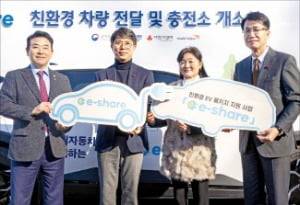 현대자동차그룹이 15일 경기 파주 장애인 직업재활시설 행복드림에서 ‘이쉐어’ 친환경 차량 전달식 및 충전소 개소식(사진)을 열었다.