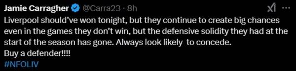 캐러거는 이날 경기에 대해 개인 SNS로 "리버풀은 오늘 밤에 승리를 놓쳤다. 계속해서 기회를 만들어냈지만 이기지 못했다. 시즌 초반의 탄탄한 수비력은 사라졌다. 당장 수비수를 사야한다"고 주장했다.
