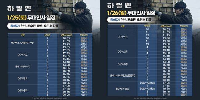 먼저 1월 25일(토) '하얼빈' 팀은 메가박스 AK플라자 수원을 시작으로 CGV 광교, 롯데시네마 수지, CGV 판교, CGV 송파를 방문한다. 다음날인 1월 26일(일) 에는 CGV 인천, 롯데시네마 부평, CGV 소풍, CGV 부천, 롯데시네마 부천(신중동), 메가박스 목동을 방문 예정이다. 무대인사 때 마다 진심 어린 팬 서비스로 무대인사 맛집으로 정평이 난 '하얼빈' 팀은 영화의 장기 흥행을 위해 앞으로도 달릴 예정이다. 무대인사 예매는 금일 중 순차 오픈 예정이며 각 극장 3사 APP을 통해 예매 가능하다.