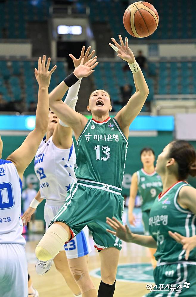 (엑스포츠뉴스 부천, 김한준 기자) 15일 오후 부천시 원미구 부천체육관에서 열린 '하나은행 2024~2025 여자프로농구' 하나은행과 우리은행의 경기, 하나은행 김정은이 점프슛을 시도하고 있다.