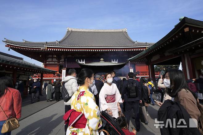 [도쿄=AP/뉴시스]2023년 1월13일 도쿄 센소지(浅草寺) 사찰을 찾은 홍콩 관광객(오른쪽)이 일본에 살고 있는 중일 여성(왼쪽)과 런던에 살고 있는 중국 여동생과 이야기를 나누고 있다. 지난해 일본을 방문한 외국인 관광객은 약 3687만명으로 2023보다 47.1% 증가하며 새로운 최고 기록을 세웠으며, 이들이 일본에서 지출한 돈 역시 2023년 대비 53.4% 급증한 8조1400억엔(75조6600억원)으로 역시 사상 최고 기록을 세웠다. 2025.01.15.