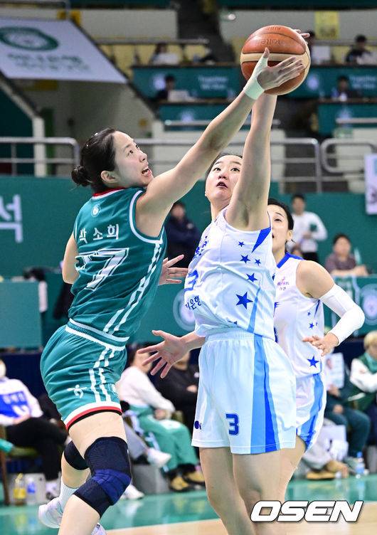 4쿼터, 우리은행 한엄지가 하나은행 박소희의 슛을 블록하고 있다. 2025.01.15 / dreamer@osen.co.kr