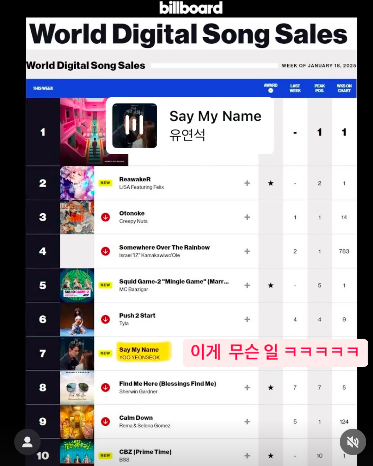 15일 유연석은 개인 소셜 미디어 계정에 “이게 무슨 일 ㅋㅋㅋㅋㅋ”이라며 자신의 부른 ‘지금 거신 전화는’ OST 곡 ’Say My Name’이 빌보드에 오른 차트를 공개했다.