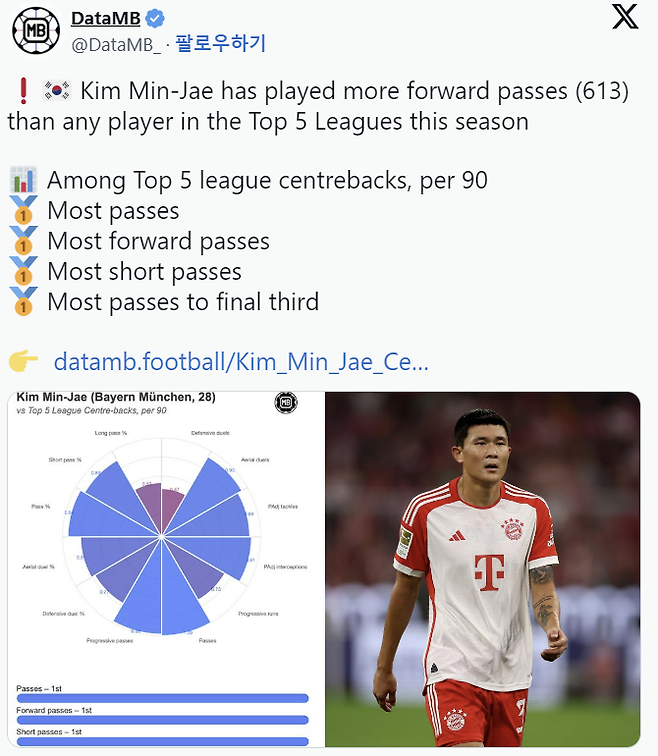 지난달 초엔 축구통계매체 '옵타'가 뽑은 5대리그 패스 회수에서 총 1831회를 기록하며 같은 팀 요수아 키미히(2089회)에 이은 전체 2위에 올라 김민재가 맨마킹은 물론 패스에서도 발군의 기량 갖고 있음을 알렸다.