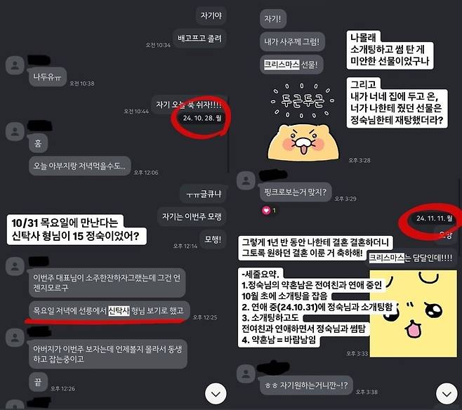 이와 함께 B씨는 A씨와 교제 당시 주고받은 대화 내용을 추가로 공개했다. B씨는 A씨와 1년 반 정도 교제했으며, 자신과 연애 중이던 지난해 10월 31일 A씨가 정숙과 소개팅을 했다고 주장했다. 또 소개팅을 한 뒤에도 한동안 자신과 연인 관계를 유지했다고도 전했다. 그러면서 "정숙의 약혼남은 바람남"이라고 꼬집었다.