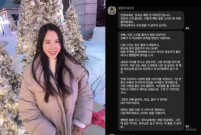 그는 "다 믿어준 내가 어리석었다"라며 "행복한 결혼을 앞두고 정숙님께는 죄송하다. 하지만 같은 여자로서 알고 계시는 게 좋을 것 같아 말씀드린다"고 덧붙였다.