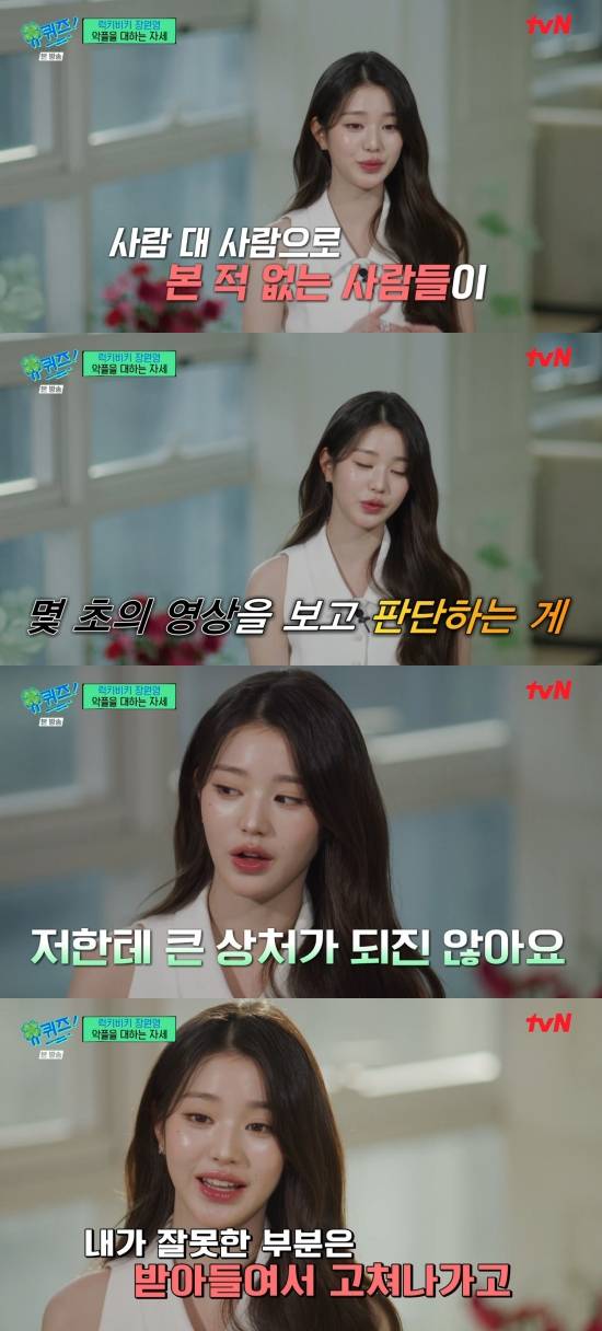 장원영은 "사람 대 사람으로 본 적 없는 사람들이고 저에 대해 극히 일부만 아는 사람들이 몇 초의 영상을 보고 그렇게 판단을 하는 게 저에게는 사실 큰 상처가 되진 않아서 오히려 저는 그런 게 '그런 사람도 있지. 여기 나를 좋아하는 사람들이 더 많아. 그럼 된 거지?' 하고 저는 내가 진짜 잘못한 부분은 '잘못했다. 고치자' 해서 받아들여서 고쳐 나가고"라며 밝혔다.