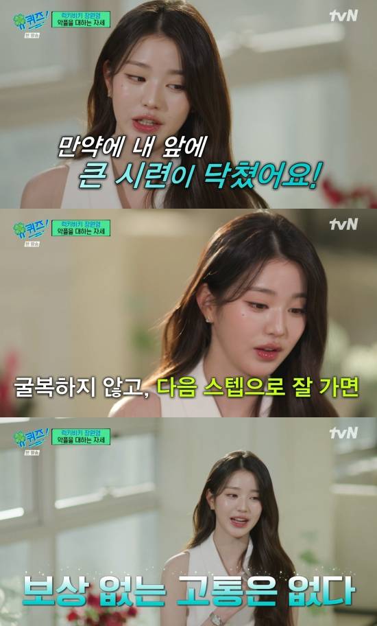 장원영은 "만약 내 앞에 큰 시련이 닥쳤다. 내가 이걸 꿋꿋하게 잘 헤쳐나가면 굴복하지 않고 잘 뛰어넘고 다음 스텝에 가면 두 배의 행운이 있다고 생각한다. 보상은 분명히 있다고 생각한다. 보상 없는 고통은 없다는 말이 있는데 저는 그걸 좀 가슴에 지니고 항상 연예계 생활도 장원영의 인생도 임하는 거 같다"라며 고백했다.