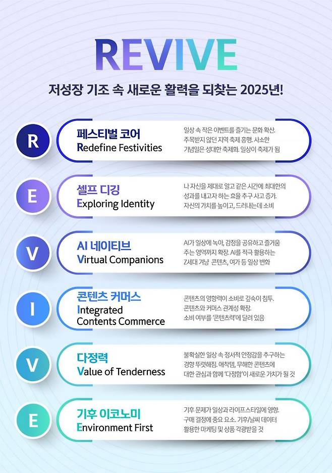 16일 신한카드 빅데이터연구소는 결제·소셜 데이터 분석을 통해 2025년 소비트렌드 키워드로 'R.E.V.I.V.E'를 제시했다. 이는 '페스티벌 코어'(Redefine Festivities), '셀프 디깅'(Exploring Identity), '인공지능(AI) 네이티브'(Virtual Companions), '콘텐츠 커머스'(Integrated Contents Commerce), '다정력'(Value of Tenderness), '기후 이코노미'(Environment First)의 머리글자를 딴 키워드다.