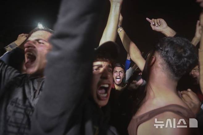 [칸유니스=AP/뉴시스] 15일(현지 시간) 가자지구 칸유니스에서 팔레스타인 주민들이 하마스와 이스라엘 간의 휴전 발표에 환호하고 있다. 이스라엘과 하마스가 가자지구 전쟁 15개월 만에 휴전 및 인질 석방에 전격 합의했다고 중재국인 미국과 카타르가 이날 공식 발표했다. 휴전은 도널드 트럼프 미국 대통령 당선인 취임 하루 전인 19일부터 단계적으로 발효될 것으로 알려졌다. 2025.01.16.