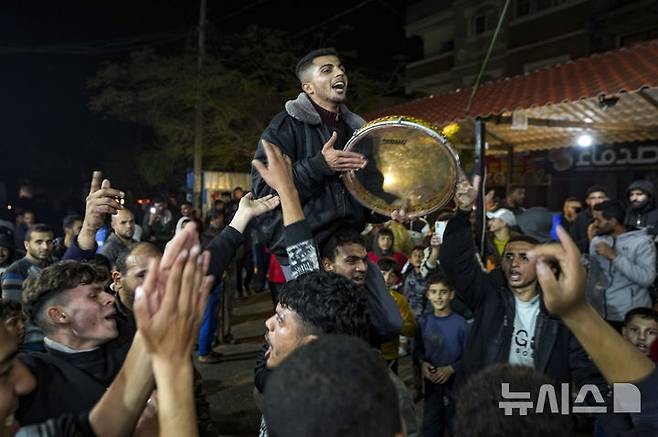 [데이르 알발라=AP/뉴시스] 15일(현지 시간) 가자지구 데이르 알발라에서 팔레스타인 주민들이 하마스와 이스라엘 간의 휴전 발표에 환호하고 있다. 이스라엘과 하마스가 가자지구 전쟁 15개월 만에 휴전 및 인질 석방에 전격 합의했다고 중재국인 미국과 카타르가 이날 공식 발표했다. 휴전은 도널드 트럼프 미국 대통령 당선인 취임 하루 전인 19일부터 단계적으로 발효될 것으로 알려졌다. 2025.01.16.