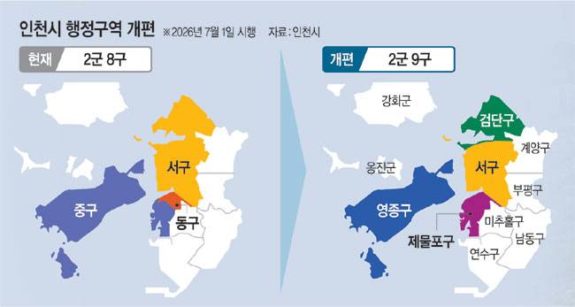 인천시의 행정구역이 민선 9기 지방자치단체가 출범하는 내년 7월 1일부터 ‘2군 9구’ 체제로 개편된다. 1995년 이후 31년 만의 변화다. 이번 개편은 인구 증가와 지역 특성 변화에 효율적으로 대응하고 지역 발전을 촉진하기 위한 목적으로 추진됐다.