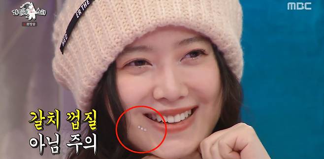 이때 구혜선 턱에 반짝이는 무언가를 발견한 유세윤은 "메이크업이냐"고 궁금증을 드러냈다.