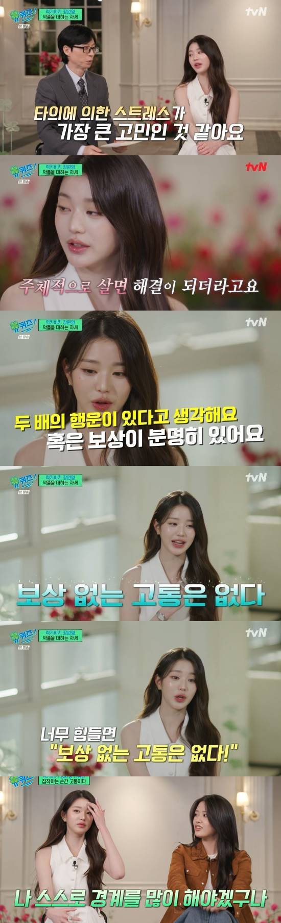 장원영은 "만약 내 앞에 큰 시련이 닥쳤다. 내가 이걸 꿋꿋하게 잘 헤쳐나가면 굴복하지 않고 잘 뛰어넘고 다음 스텝에 가면 두 배의 행운이 있다고 생각한다. 보상은 분명히 있다고 생각한다. 보상 없는 고통은 없다는 말이 있는데 저는 그걸 좀 가슴에 지니고 항상 연예계 생활도 장원영의 인생도 임하는 거 같다"고 말해 이목을 모았다.