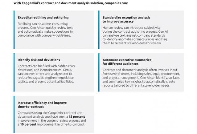 캡제미나이의 계약 및 문서 분석 솔루션을 도입한 기업들은 콘텐츠 검토 과정에서 15%의 효율성 향상을 경험했으며, 계약 체결 소요 시간도 10% 단축된 것으로 조사됐다. 이는 기업의 계약 관리 비용 절감과 직접적으로 연결되는 중요한 성과다.