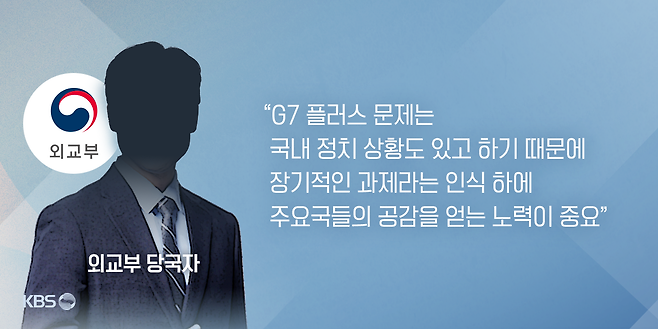 외교부 당국자는 "국내 정치 상황도 있고 하기 때문에 이 부분(G7 플러스 가입)은 장기적인 과제라는 인식 하에, 주요국들의 공감을 얻는 노력이 중요하다"고 설명했습니다.