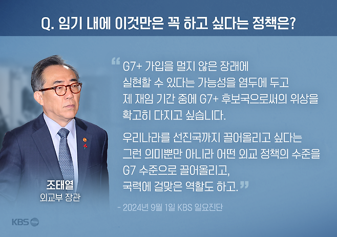 조태열 장관의 이루고 싶었던 정책 1순위, G7 플러스 가입과 관련해선, "우리 대외정책의 일관성 유지를 위해 G7과의 협력 강화 지속 추진한다"고만 적었습니다.