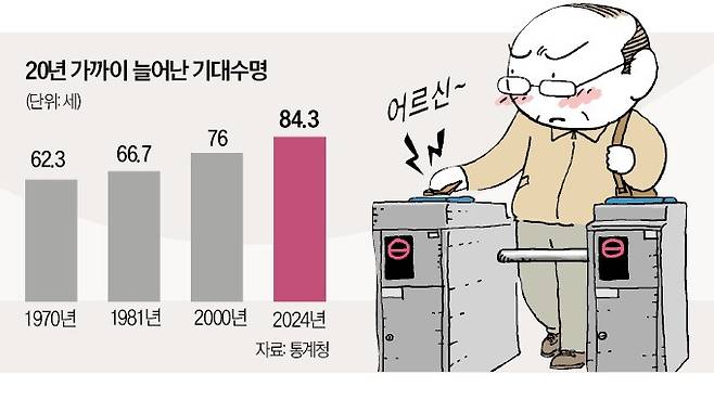 가장 큰 쟁점으로 떠오른 노인 복지사업은 지하철 무임승차제다. 노인복지법에 따라 65세 이상 노인은 지방자치단체가 운영하는 지하철을 무료로 탈 수 있다. 1981년 법 제정 당시부터 지금까지 노인 연령 기준은 44년째 그대로다. 그 사이 기대 수명은 66.7세에서 84.3세(2024년 기준)로 17.6세나 늘어났다. 65세 이상 인구 비중도 20%를 넘어서며 지자체 재정 부담은 눈덩이처럼 불어나고 있다. 서울교통공사에 따르면 매년 지하철 무임승차제로 인한 적자는 3663억원(2023년 기준)에 달한다.