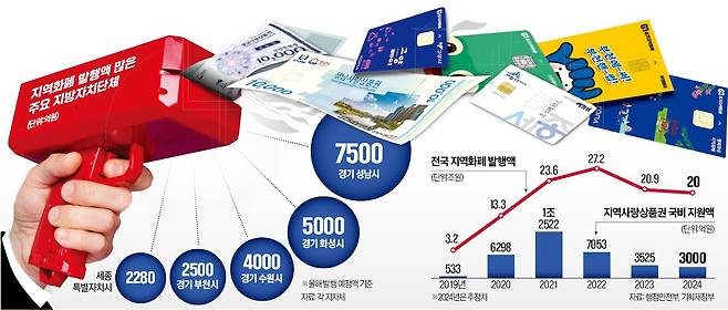 수도권의 이른바 ‘부자 지방자치단체’가 올 들어 지역사랑상품권(지역화폐) 발행 규모를 대폭 늘리고 있다. 반면 재정 형편이 빠듯한 비수도권 지자체는 지역화폐 발행 규모를 줄이고 할인율도 축소하고 있다. 지역 경제를 살린다는 취지의 지역화폐가 지역 불균형을 초래하고 지자체 간 ‘제로섬 게임’을 유발할 수 있다는 지적이 나온다.