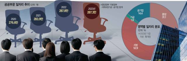 통계청이 16일 내놓은 ‘2023년 공공 부문 일자리 통계’에 따르면 재작년 공공 부문 일자리는 287만 3000개로 전년 대비 5000개(-0.2%) 줄었다. 공공 부문 일자리 수가 감소한 것은 2016년 통계 작성 이래 최초다. 공기업 일자리는 41만 4000개로 전년과 동일한 수준을 보였지만 중앙과 지방정부를 합한 일반 정부 일자리가 245만 9000개로 5000개(-0.2%) 줄며 전체 일자리 수 감소를 이끌었다.