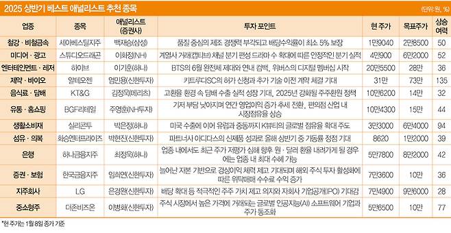 게임 부문도 주목할 섹터다. 임희석 미래에셋증권 애널리스트는 시프트업을 주목했다. 임 애널리스트는 “2025년 2분기 예정된 모바일 슈팅 게임 ‘니케’의 중국 서비스 시작과 모바일 액션 역할수행게임(RPG) ‘스텔라 블레이드’의 PC 확장으로 강력한 주가 모멘텀을 예상한다”며 “글로벌에서 증명한 콘솔 게임 개발력을 고려하면 국내에서 가장 높은 멀티플을 부여받을 수 있는 게임사”라고 높게 평가했다. 임 애널리스트는 시프트업 목표주가를 9만5000원으로 제시했다.