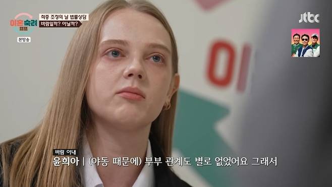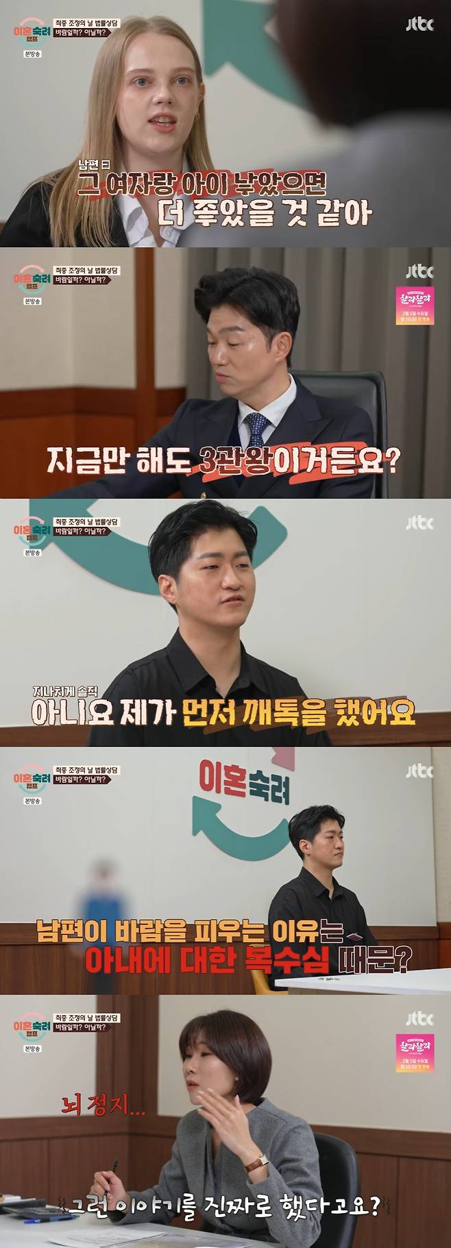 첫 번째로 바람 부부 김찬호, 윤희아가 나섰다. 남편은 '아내는 어떤 거 같냐'는 변호사의 물음에 "제가 힘들게 한 게 많으니 아직 이혼하고 싶어하지 않을까"라고 전했다.